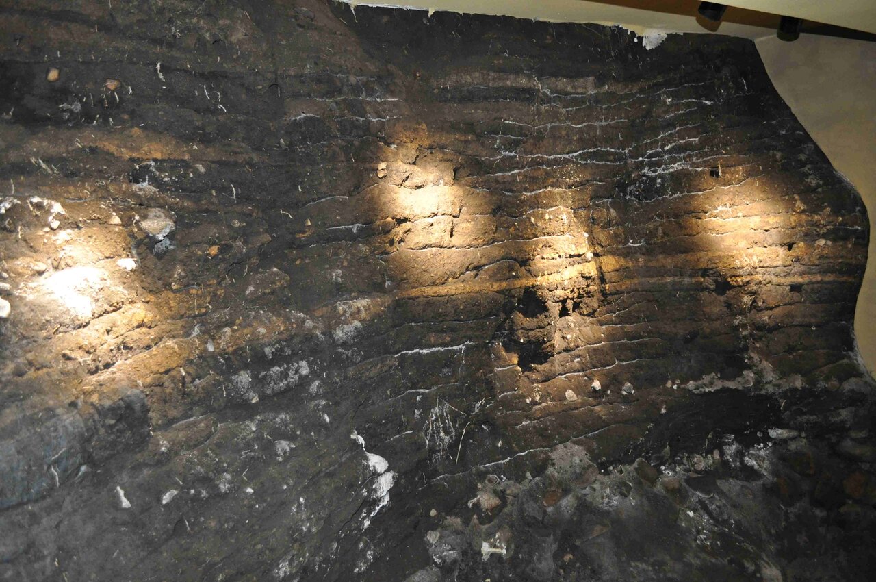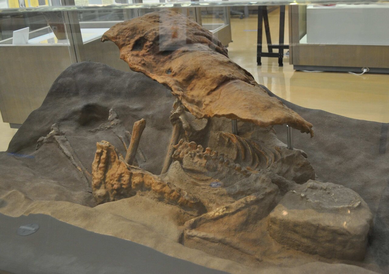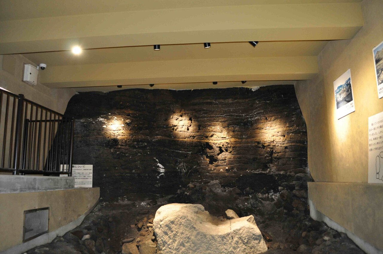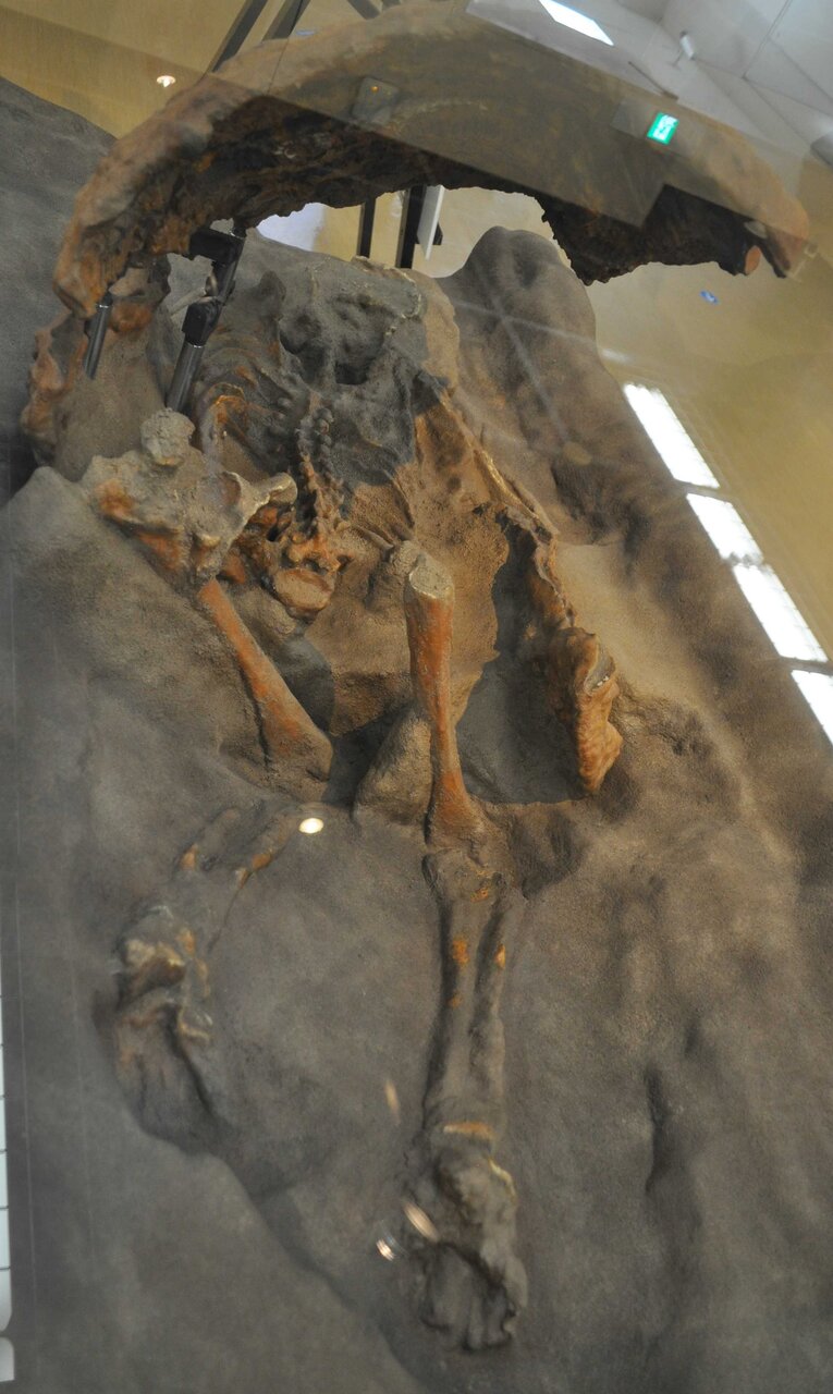 渋川市の金井東裏遺跡のものだが、今まで背中のヨロイだけが姿を見せている写真しか知らなかったのだが、ここでは、その背中側のヨロイが上に持ち上げられるようにして、中の人骨の様子がリアルに見れるようになっているのだ。ひざまづいてそのまま前のめりに倒れ込んだようにして、火砕流に埋もれてしまったような状態がとてもよくわかる。鎧兜を身に着けて、怒れる火山を鎮めようと祈っていたのであろうか。