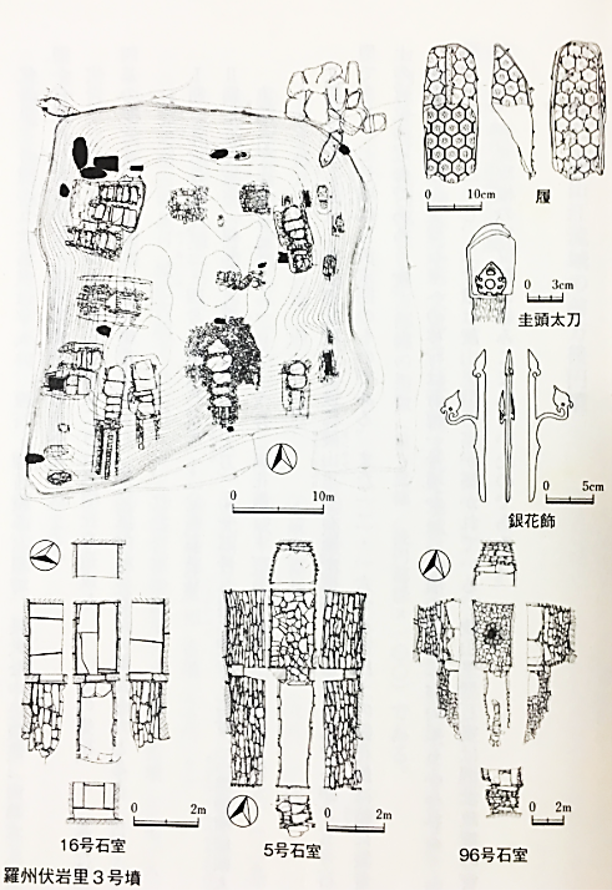 古墳人に近接の2号甲には、鹿角製の小札があった。これは類例が夢村土城(ソウル特別市松坡区芳荑洞・五輪洞)にある三国時代百済前期の都城遺跡にあった。