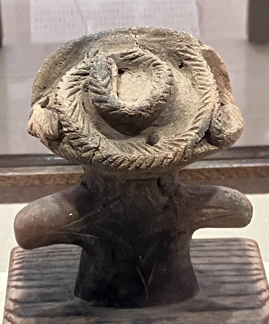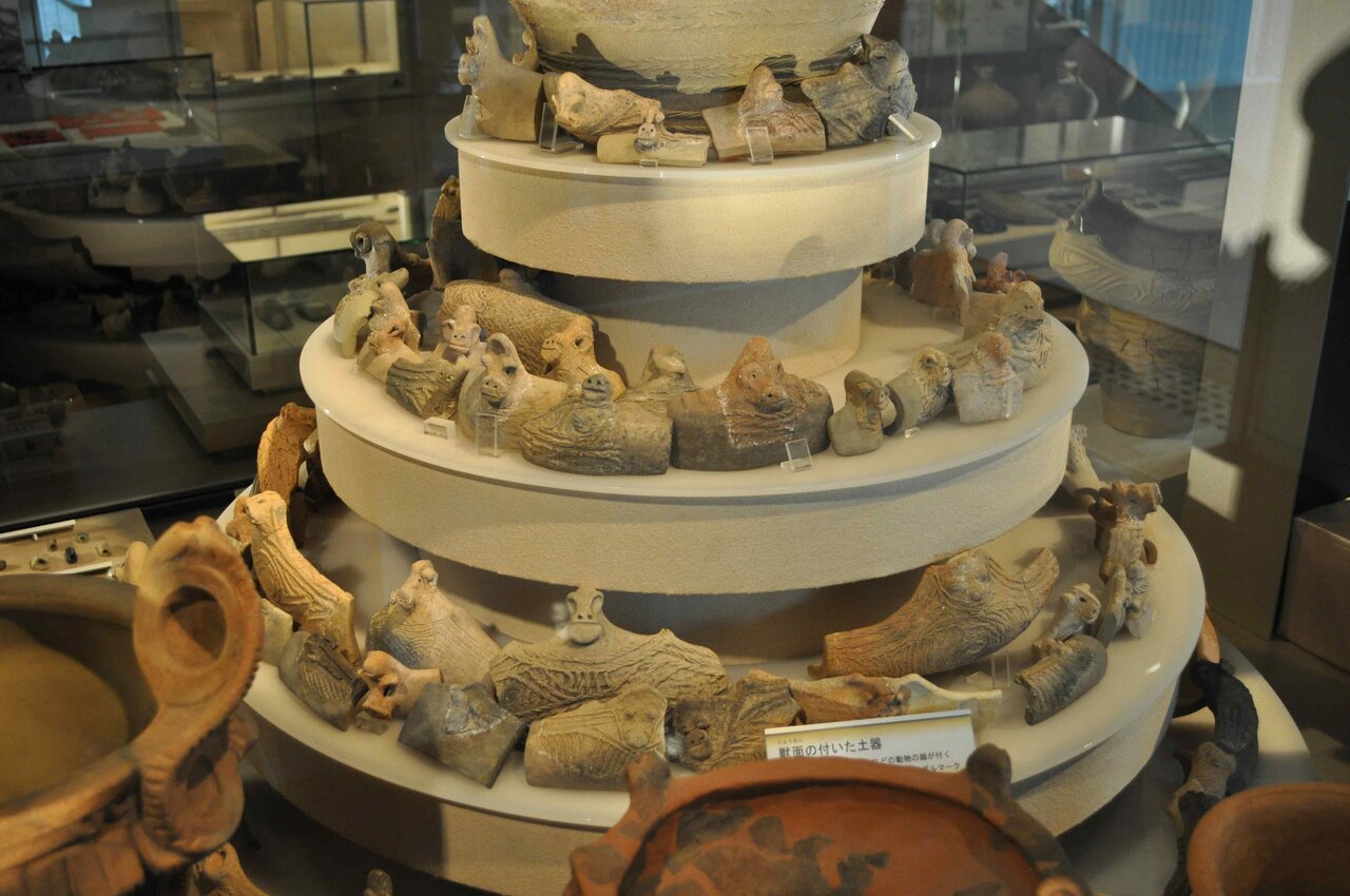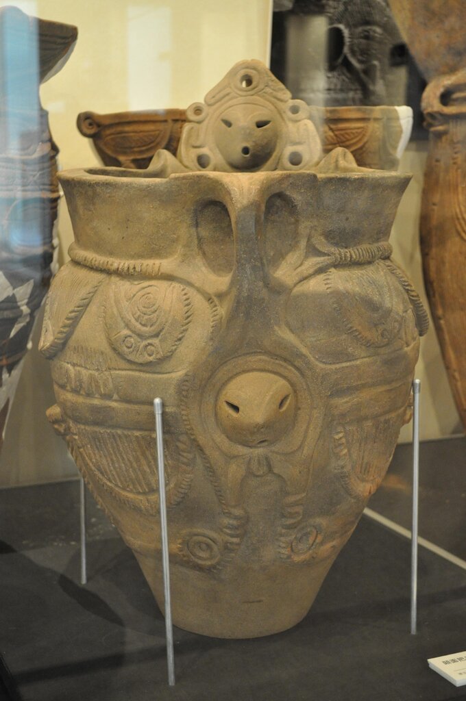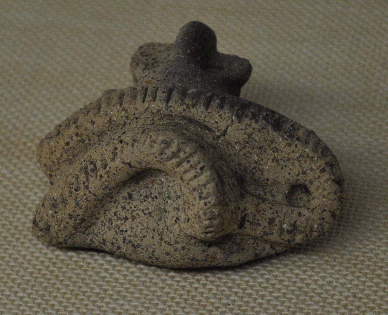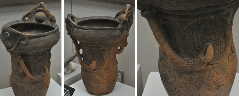 縄文土器には、把手なのか、文様なのかよくわからない眼鏡状とか、橋状とも言われている双環突起がついています。土器によっては、そこに腕のようなものが伸びていたり、蛙や蛇の頭のような表現ともとれるものもあります。そして、いわゆる出産文土器にも少し大きめの双環突起が口縁部についています。