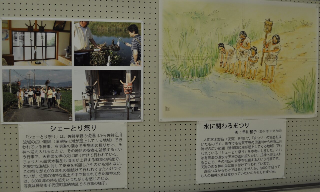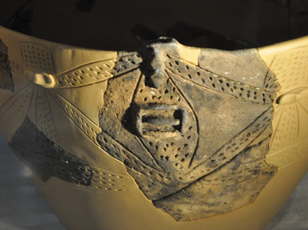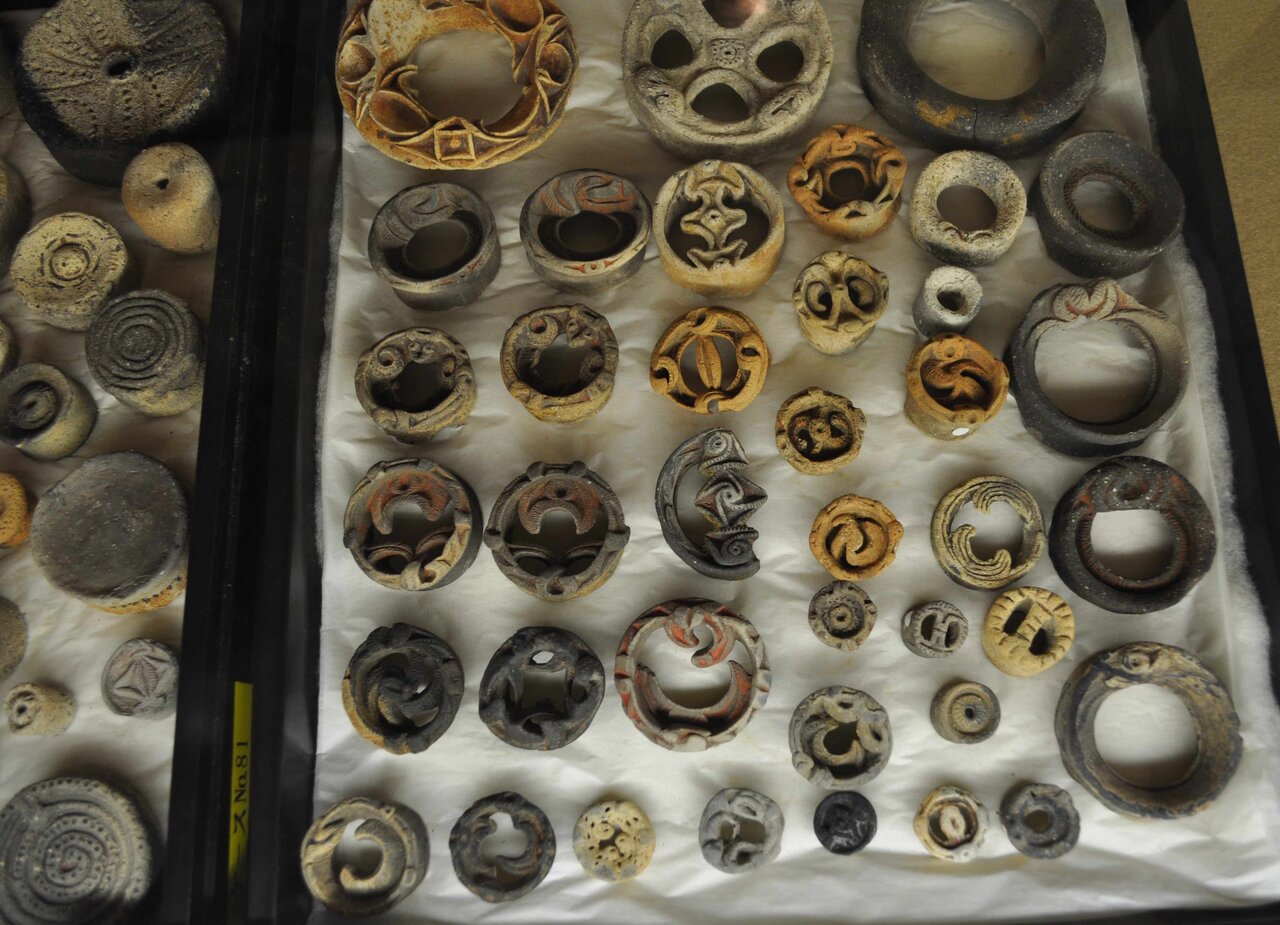 縄文土器には、把手なのか、文様なのかよくわからない眼鏡状とか、橋状とも言われている双環突起がついています。土器によっては、そこに腕のようなものが伸びていたり、蛙や蛇の頭のような表現ともとれるものもあります。そして、いわゆる出産文土器にも少し大きめの双環突起が口縁部についています。