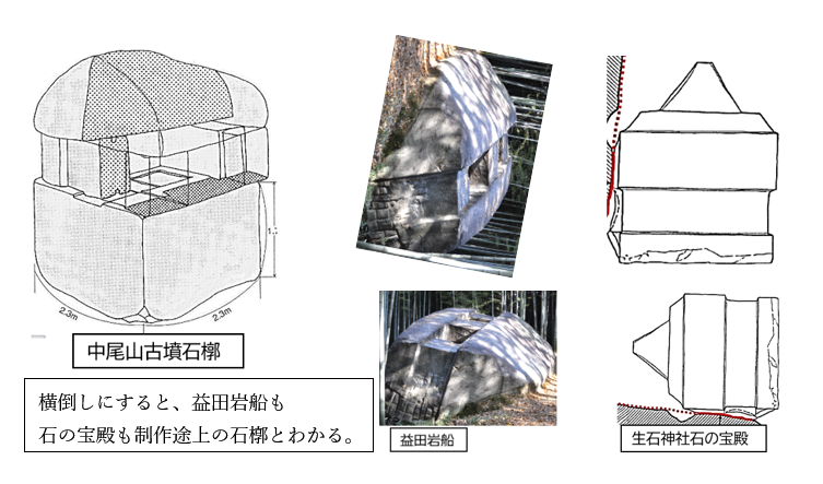 八角形の墳丘から文武天皇陵と考えられるようになった中尾山古墳は、巨大な台石に磨かれた石を組み合わせて石槨にしたものだ。その石槨の全景が、石の宝殿を横倒しにした様と類似していることが分かる。松本清張氏がゾロアスター教の拝火檀と考えた益田岩船も同様の未完成の石槨なのだ。下に向かって石室を彫り、完成後に横倒しにして設置しようとしたのかもしれない。ただし、中尾山の場合は巨大な台石の上に加工した石室を組み合わせて重ねている。横口式石槨ともいわれるが、石の宝殿や益田岩船の場合は、台石を含んだ石室として完成させようとしたのであろうか。