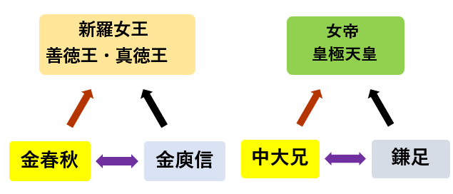 なお、この鎌足の台詞は、新羅王の金春秋の側近である金庾信の最後の言葉を真似ていると考えられる。以下のようである。病に伏す金庾信を文武王が慰問する。その時の言葉が、「臣は愚かで不肖でありましたから、どうして国家に対して有益であったと言えるでしょう」とあるように、鎌足の言葉に活用されたのである。日本書紀はこのエピソードを利用して、鎌足のミソギとしたかもしれない。金春秋と金庾信については次項で説明する。
